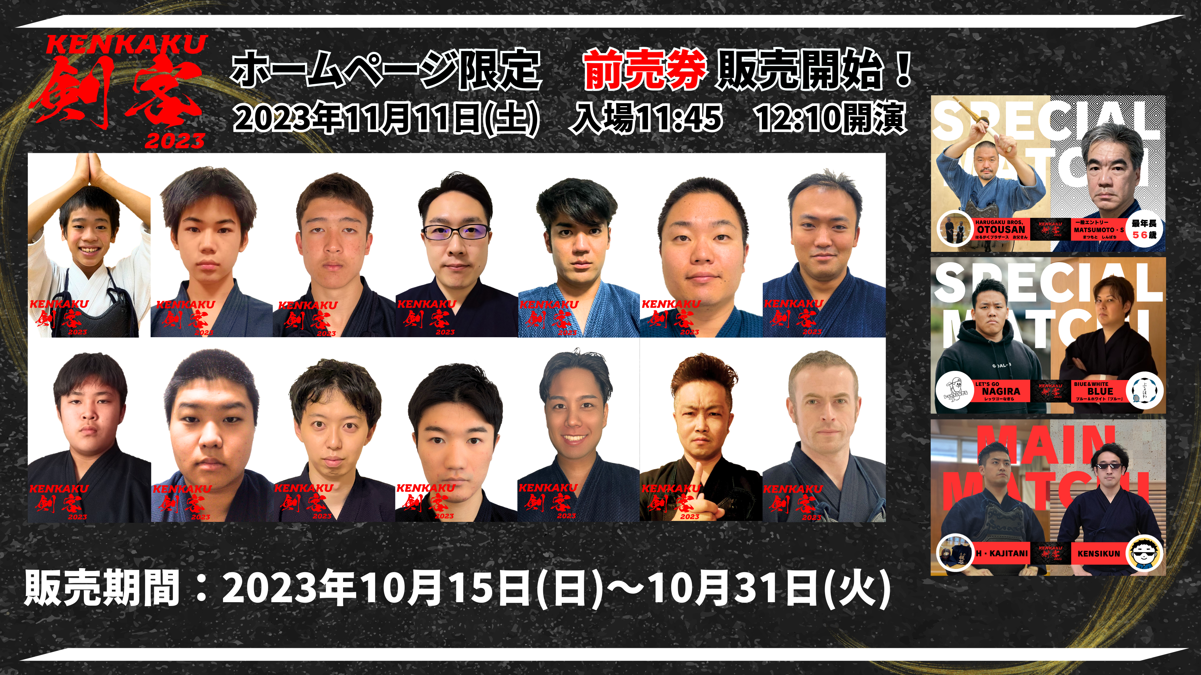 剣客2023では皆様からの熱いご要望にお応えして、当日現地で剣客の全試合をご観戦いただけるチケットの販売をすることに決定いたしました。チケットの詳細につきましては、以下の情報をご確認くださいませ。